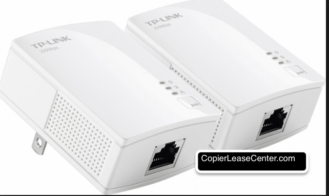 Here is one on Amazon for like $30 – Going up in price certainly does not hurt as it will improve speed. The basics of this adapter is it uses the copper in your building’s power lines in lieu of an actual network cable. Doing it this way, the device is connected and there is a connection between the router and the copier, even if it is across the building or room. We love how this technology makes it so any copier can be made wireless when connected to the router or put on the network if plugged into a network switch. We have tried this technology out ourselves and it made setting up copiers much easier than using manufacturer WiFi network connectivity kits.
